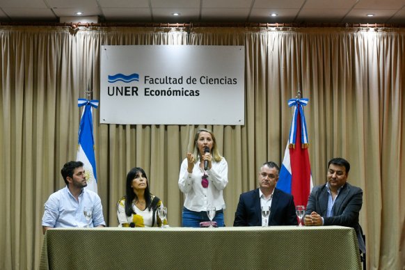 La vicegobernadora Laura Stratta y la electa Alicia Aluani, junto al coordinador del Instituto de Formación Legislativa, Daniel Almada; el decano de la Facultad de Ciencias Económicas, Sebastián Pérez; y el secretario de Extensión y Bienestar, Alexis Bilbao, estuvieron presentes en el acto de apertura.